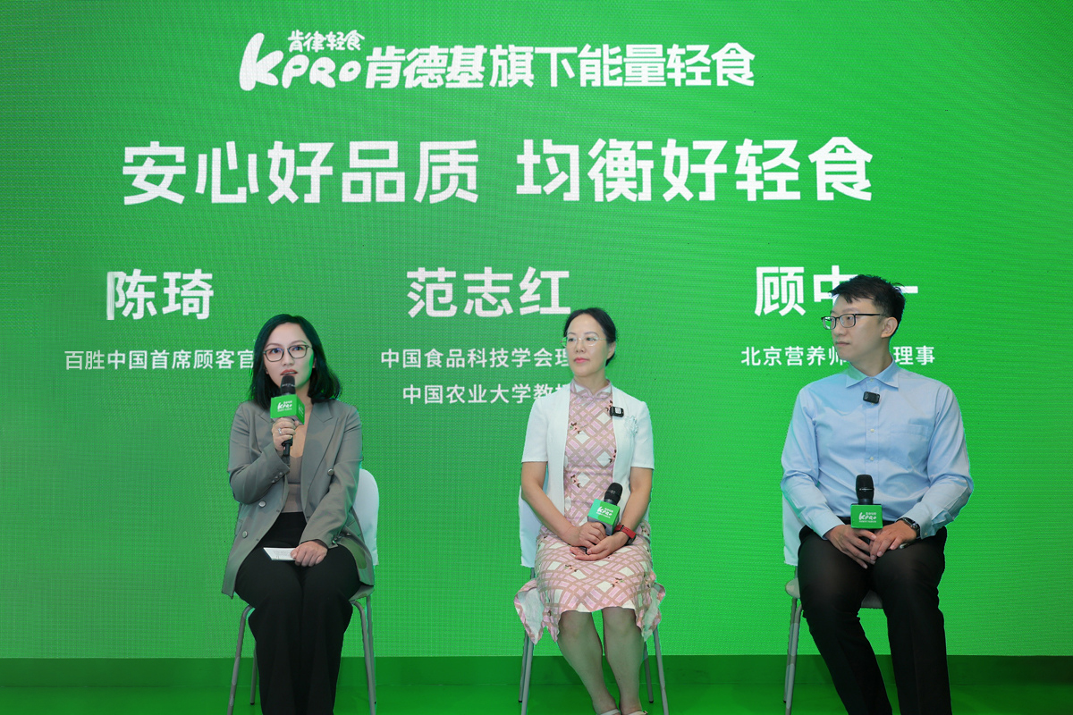 圍繞“安心六承諾”,中國食品科技學會理事、中國營養(yǎng)學會食物與烹飪營養(yǎng)分會副主委、中國農業(yè)大學教授范志紅,北京營養(yǎng)師協(xié)會理事顧中一,百勝中國首席顧客官陳琦分別從營養(yǎng)科學的落地、消費者視角的健康升級和KPRO肯律輕食的實踐探索等維度展開討論。